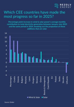 This is, clearly, very encouraging. Some might point out that it is easier for CEE countries to increase the proportion of wind and solar when: a) many of them started 2024 from a lower base than the EU average, and b) they are mostly relatively small countries, where every installed megawatt has a more sizeable impact than it would in a larger country. However, the fact that 10 CEE countries added more wind and solar capacity as a percentage of total electricity generation than the EU average is still good news, and a 5%+ uptick in a single year – delivered by Estonia (+8.89%), Bulgaria (+5.60%), Croatia (+5.49%) and Hungary (+5.10%) – should not be underestimated in any country. It is a very significant achievement indeed.